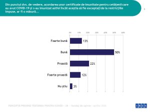 # O eventuală măsură de acordare a unor ”certificate” / ”pașapoarte” de imunitate celor care au avut deja COVID – 19 pentru a putea beneficia de excepții de la anumite restricții este considerată bună de către jumătate dintre români. 13% o consideră foarte bună, în timp ce o treime dintre participanții la studiu cred că ar fi proastă și foarte proastă.