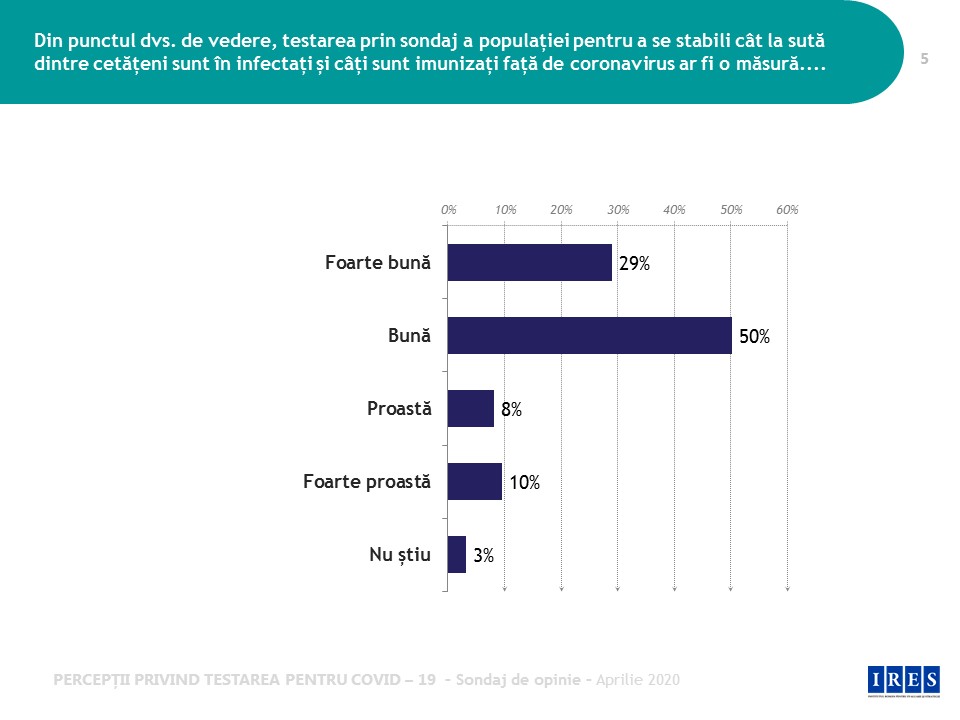 Sondajul arată că populația manifestă un grad ridicat de acceptabilitate pentru testarea prin sondaj în vederea stabiliri ponderii cetățenilor infectați cu COVID-19 și a celor imunizați la coronavirus. Peste un sfert dintre participanții la studiu cred că testarea prin sondaj este o măsură foarte bună, iar jumătate o consideră ca fiind bună.