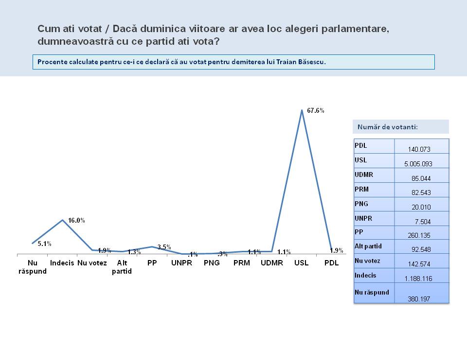 După cum se vede ușor, opțiunea pentru USL este covârșitoare, dintre cei 7,4 milioane, peste 5 milioane vor să voteze USL la toamnă, în condițiile în care nimic nu se schimbă fundamental. Nu știu în ce măsură criza care a urmat votului din 29 iulie a influențat intențiile de vot, este posibil să se fi întâmplat și asta, dar duminică, 29 iulie, USL avea cel mai mare scor pe care l-a avut vreodată, pe vreun segment electoral. Sigur, procentul era determinat și de boicotul PDL , al UDMR și de pasivitatea neutrală arătată de Dan Diaconescu.