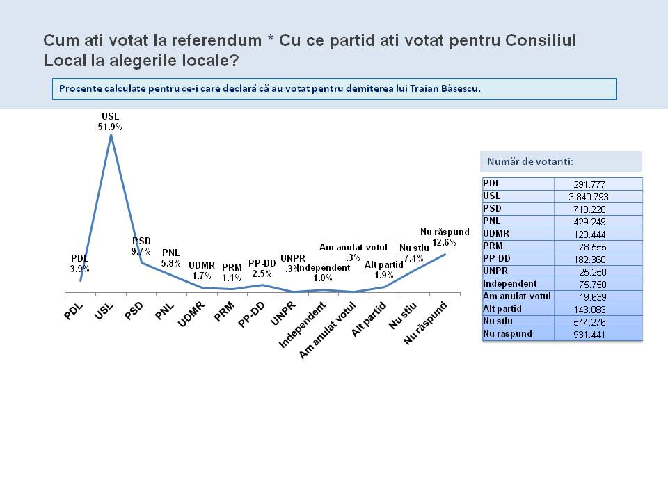 Dacă vorbim despre cei care au votat cu DA și au votat și la alegerile locale o să observăm că majoritatea adversarilor lui Traian Băsescu au votat la locale USL sau partidele componente.