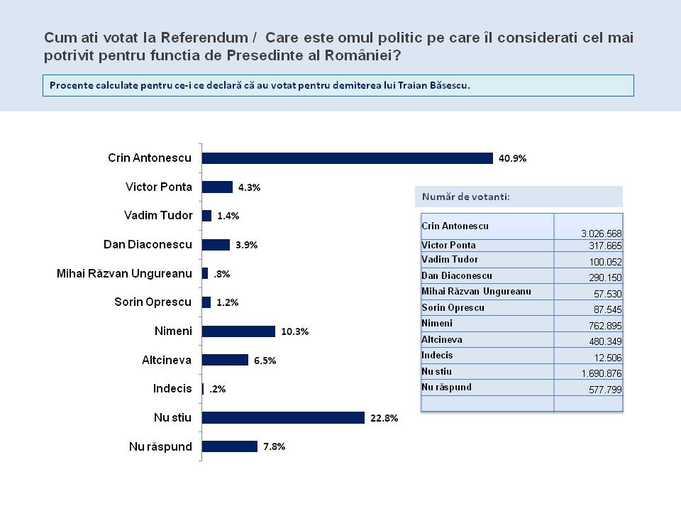 Cei care au mers la vot și au spus NU, nu pot fi trecuți în categoria băsiști incurabili, cum o fac jurnaliștii adesea. Vreo 40.000 ar vota Antonescu, vreo 50.000 Diaconescu, 42.000 au diferiți candidați minori și doar 31% (aproape 300 de mii) sunt fani ai Președintelui suspendat. Ciudat este că doar 6% dintre ei îl consideră Președinte ideal pe Mihai Răzvan Ungureanu, speranța dreptei civice. In mod evident esantionul celor care spun NU a fost viciat de boicot, el nu este reprezentativ pentru votanții de dreapta, dar chiar și acest esantion autoselecționat arată lipsa de soluții a electoratului din România când este vorba să caute politicieni.