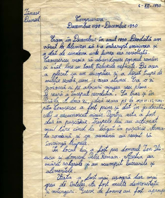 In 1990, când nu aveam blogosfera, istoria se scria cu alte ocazii si alte mijloace. Istoria este o constructie, literară aproape, si dacă nu aş avea mai multi prieteni dragi, excelenti intelectuali proveniti din istorici, aş spune că istoria este 50% mitologie şi discurs identitar. Au fost cronicari care au scris istorii duble, pe placul celor care plăteau dar si pentru posteritate. Mereu insă s-au scris istorii naive, nefabricate dar influentate de ideologiile sau fantasmele vremii. Ele sunt marturii importante si ne pot ajuta si pe noi insine să facem o arheologie a sentimentelelor sau emotiile sedimentate in cunoasterea si atititudinile noastre de acum. Ma emotionează aceasta compunere scrisa de un micut moldovean (se vede poetica textului cronicaresc moldav) in decembrie 1990. Viata a fost mai usoară, dar mai usor de inteles, zice elevul Tănase Daniel din Braila.