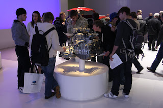 Nu fac decat zece metri, pe platoul de la etajul I, cel cu Ferrari, Lamborghini, Maybach etc și văd deja un sector spatios cu o inscriptie mare: DUSTER. Nu-mi vine să cred, nu ma apropii imediat, dau o tură pe langă stand, fac fotografii si mă uit cu coada ochiului peste multime. Oare este cineva la standul nostru? Ma apropii cu grija, ca si cum as deschide hartia creponata de pe un cadou: la standul Dacia este plin. Incerc să fac fotografii, dar este greu și să privesc de aprope primul SUV adevarat produs in Europa de Est pentru ca este plin de oameni. Mă uit la hainele lor, nu sunt bogații lumii dar sunt foarte multi oameni tineri. Intra in masină, citesc pliante, se uita la detalii, cer sa vadă motorul. Standul este perfect organizat: automate de informatii, motoare demonstrative care functionează, proiectii, mici obiecte promotionale date gratis (singurul stand generos).