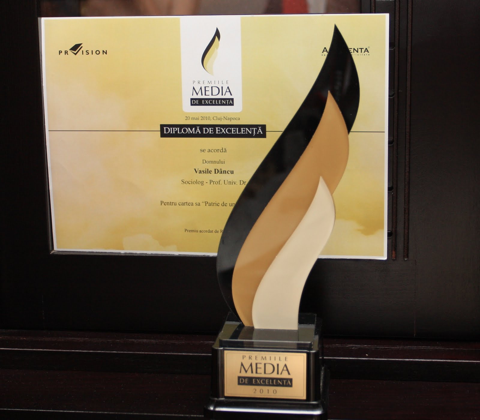 La Gala premiilor media de excelenta Realitatea TV Cluj mi-a acordat aceasta distinctie pentru ultima mea carte. Ma surprinde orice eveniment in care o carte devine subiect principal macar pentru o clipa. Multumesc prietenilor de la Realitatea TV pentru ca in aceste momente de criza au premiat o carte si nu un potentat din administratie ori vreun om de afaceri. Ei sunt o cutie de rezonanta deschisă pentru orice idee noua sau om care are ceva de spus.