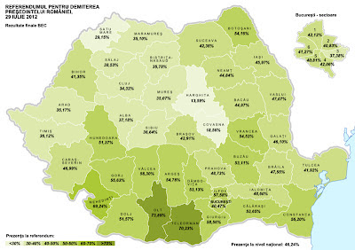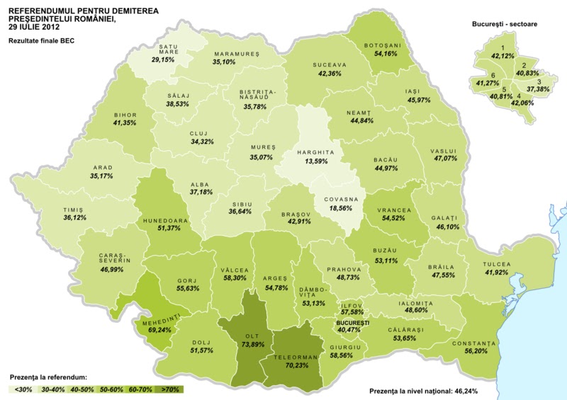 Acum să ne uitam la harta procentelor prezenței la vot la referendum.