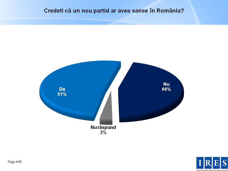 Aşa a fost cu sintagma lui Sebastian Lăzăroiu ALBA CA ZĂPADĂ. Toată lumea o așteaptă pe Alba ca Zăpada după colț, să fie primul care îi pupă mâna, ori îi trage o înjurătură, după caz. Un priceput jurnalist politic cu blog vede o strategie băsesciană în studiul nostru despre un nou partid. I-aş spune băiatului respectiv că, dacă ar fi studiat cu atentie sondajele din ultimii ani, ar fi vazut că nimic nu s-a schimbat, nimic nu este nou. De vreo câţiva ani peste 50% dintre români spun că ar avea un nou partid ar avea o şansă, iar vreo 40% declară că ar vota cu aceast partid. Este o întrebare ipotetică, iar oamenii se referă la ceva ideal. Sunt sătui de actualele partide politice şi, pentru o clipă, poate că se gândesc chiar că ar putea să se elibereze. Evident, când acel partid apare, oamenilor nu le convine cine îl conduce, nu agreează ideologia sau nu sunt interesaţi de mersul la vot.