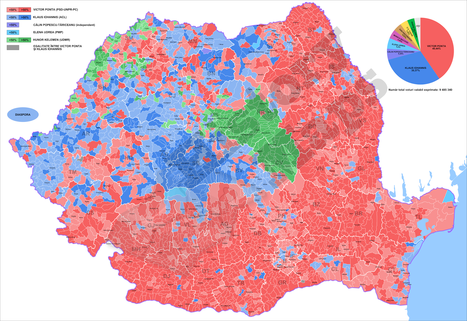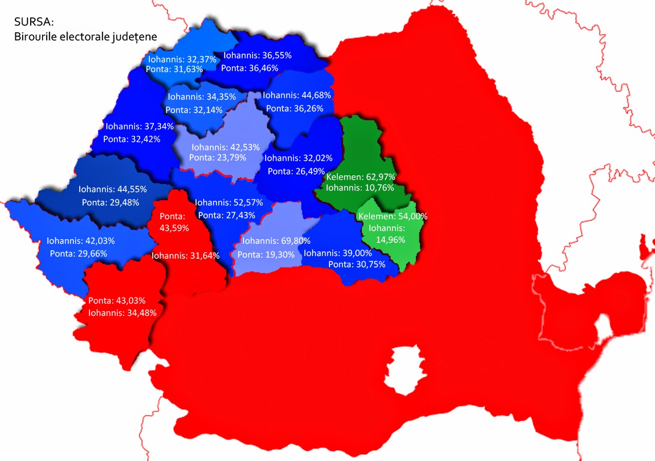 Dacă am avea o hartă mai detaliată, am vedea și o mai mică omogenitate. Aici vedem formațiuni mai mari, dar pe o hartă în care am vedea fiecare localitate cu culoarea specifică ar dispărea și mai mult senzația de zid care ne separă. În plus, culoarea dominantă apare chiar dacă localitatea a fost câștigată de un candidat la 3 voturi distanță. Iohannis a luat și în sud foarte multe voturi, mai ales în mediul rural, la fel cum Ponta a câștigat voturi în Transilvania și Banat. Dacă am lua numărul de localități, fără a discuta și despre mărime, probabil că Ponta a avut mai multe câștigate în Transilvania și Banat, ceea ce ar fi tot un raționament superficial, care nu arată realitatea, ci doar o inferență statistică.